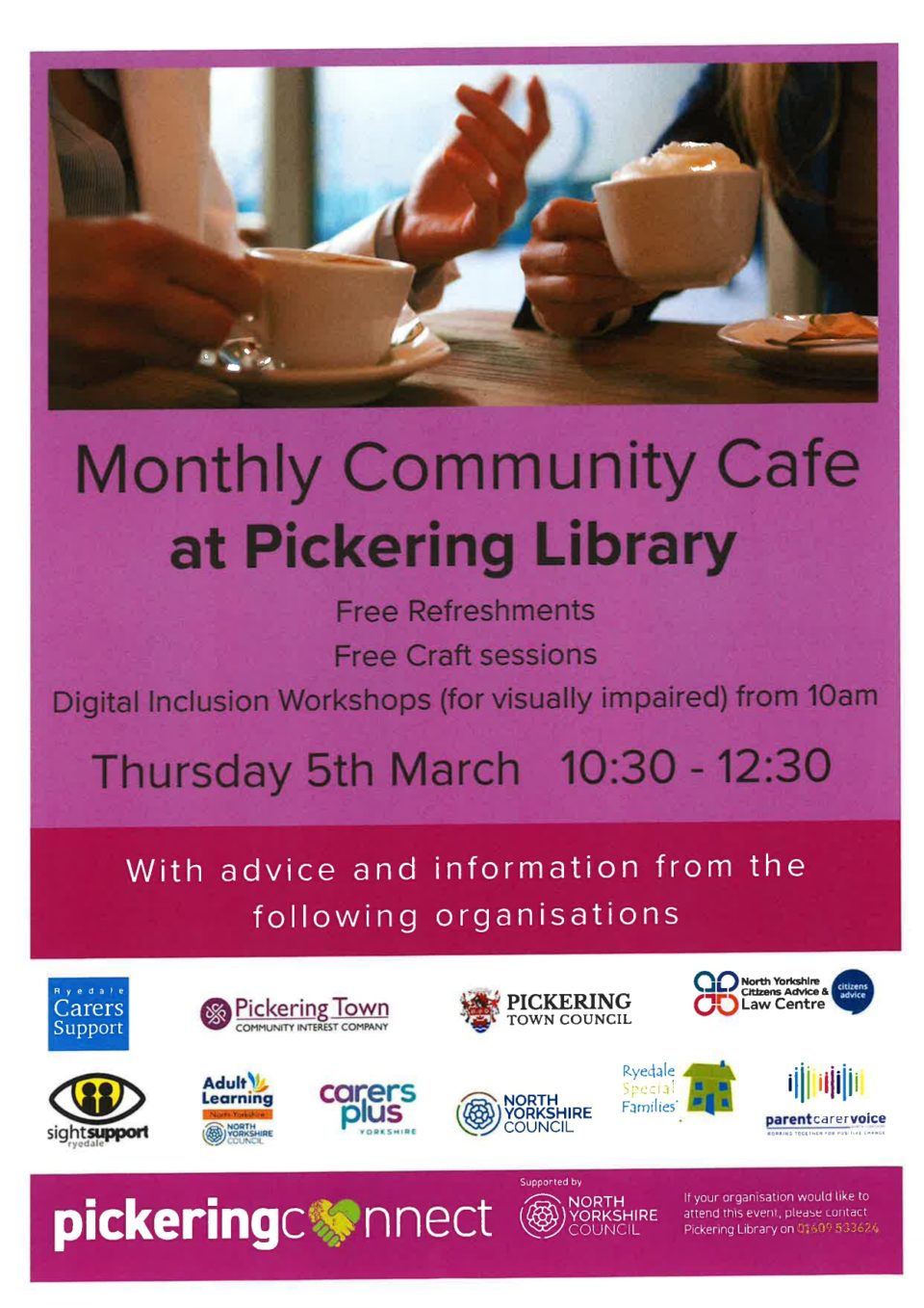 Need Help? Unsure Where to Turn? Pickering Connect presents: Monthly Community Café Looking for friendly support, useful information, or just a welcoming place to drop in? Join us at the Monthly Community Café in Pickering. What’s on offer: Free refreshments Free craft sessions Digital Inclusion Workshops (for visually impaired people) Advice and information – an[…]