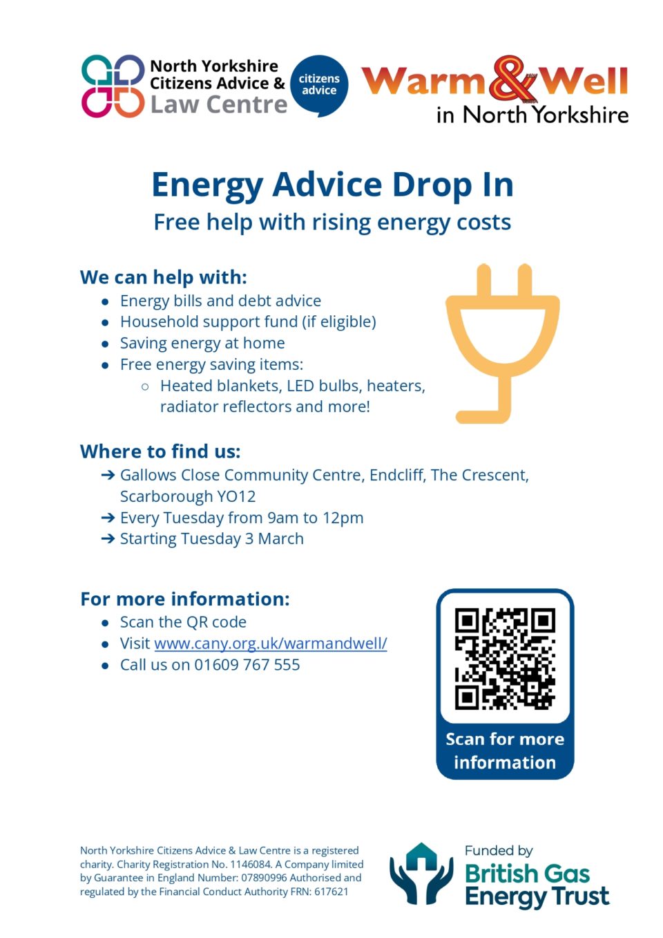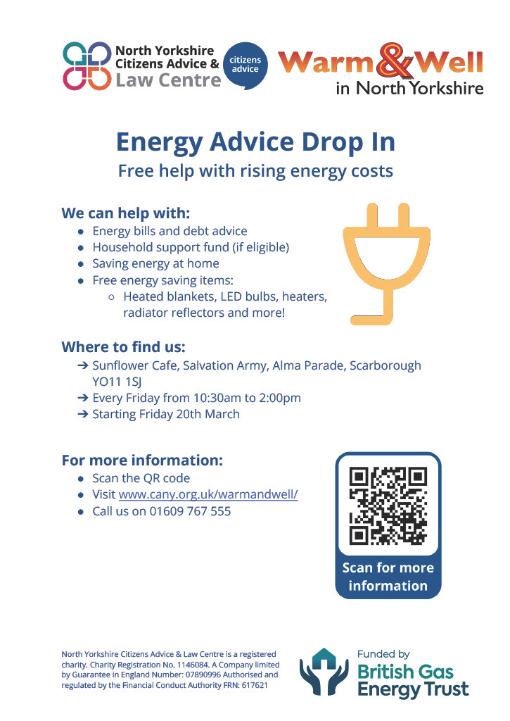 Struggling with rising energy costs? We’re here to help! The North Yorkshire Citizens Advice & Law Centre is hosting a free energy advice drop-in at the Sunflower Cafe in Scarborough. If you need support with your energy bills, want tips on saving energy at home, or are eligible for the household support fund, come along[…]
