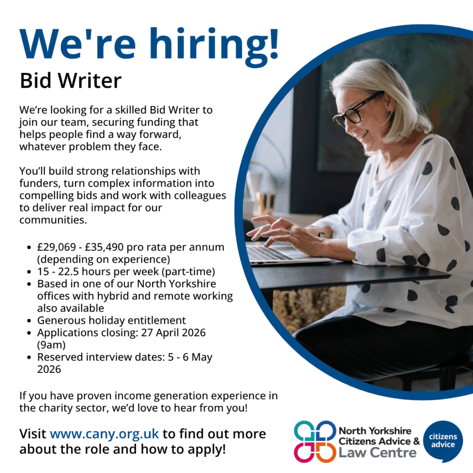 We’re pleased to be attending Sights and Sounds of Ripon on Friday 14 March from 10am to 2pm. This free community event for HG4 residents will feature activities taking place across the city, with plenty for the whole family to enjoy. Come and say hello to the team from North Yorkshire Citizens Advice and Law[…]
